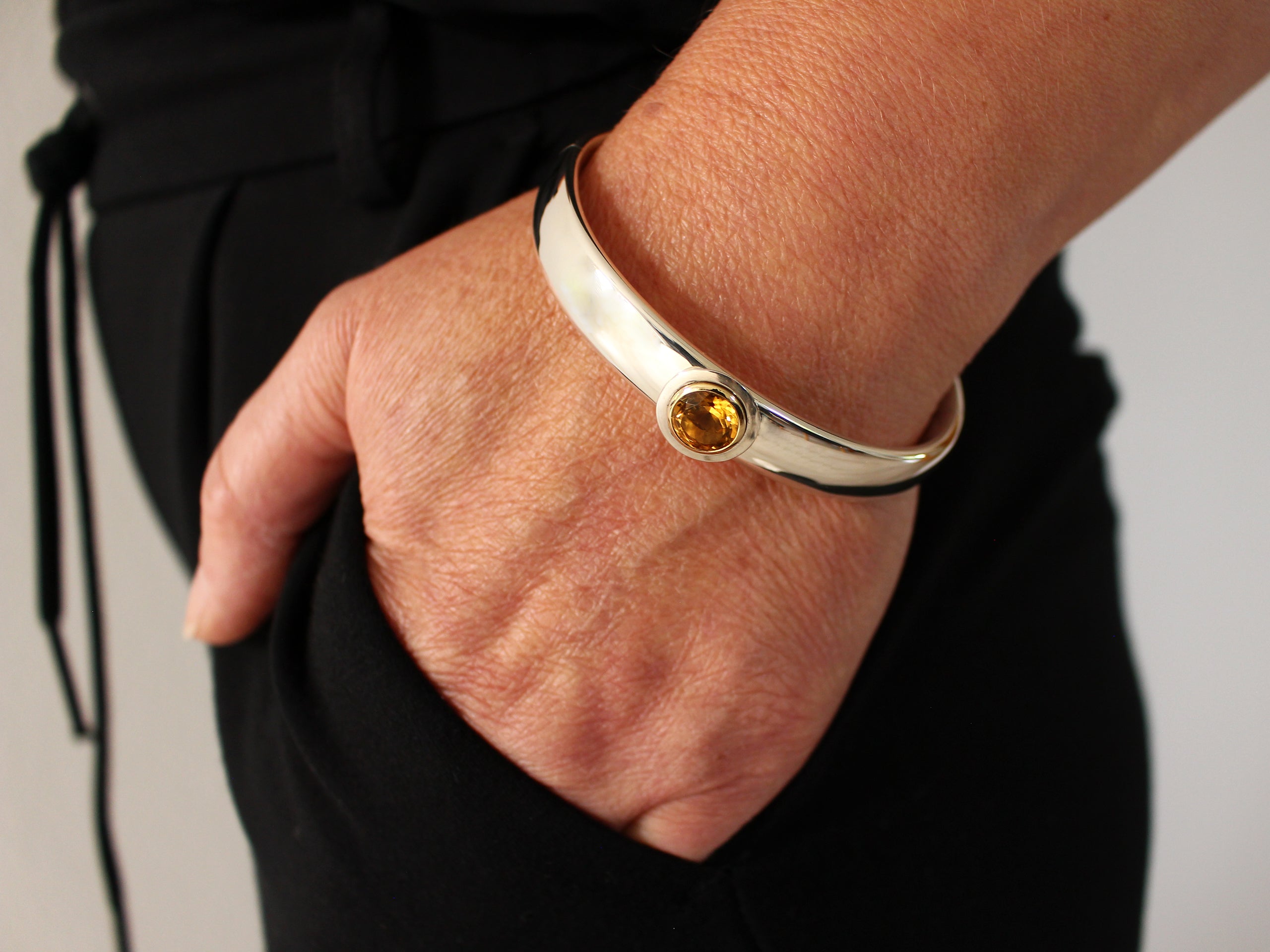 Ein runder Citrin, gefasst in Silber, trifft auf eine Haltung, die Eleganz neu denkt: entspannt, klar und zugleich voller Energie. Dieser Armreif zeigt, dass Licht nicht nur glänzen, sondern auch ganz selbstverständlich getragen werden kann – unaufgeregt und doch unverkennbar.