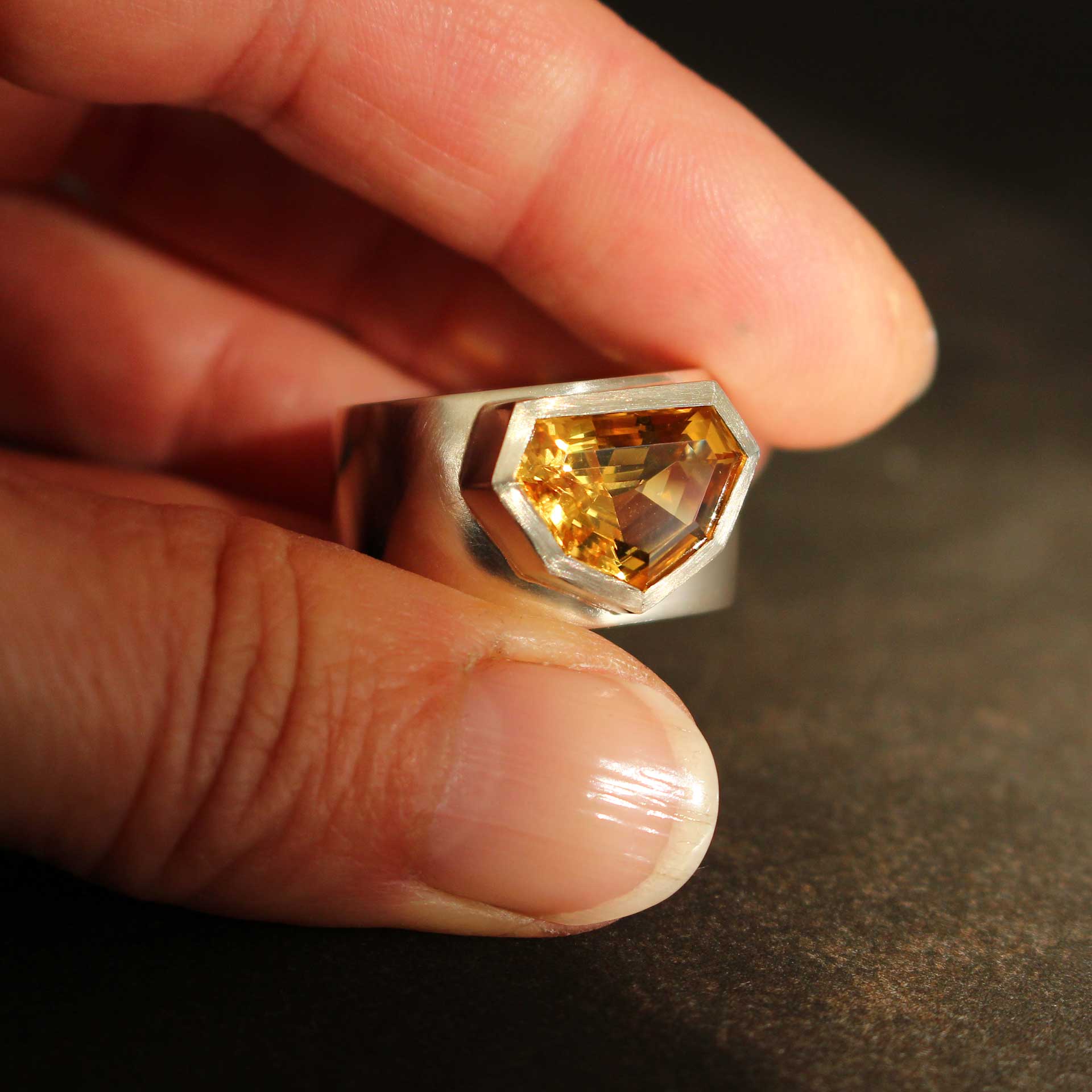 Im Navette-Schachbrettschliff zeigt der Lemon Quarz seine ganze Strahlkraft – intensiv, klar und facettenreich. Eingefasst in poliertes Silber und getragen von einer markanten, geschwärzten
